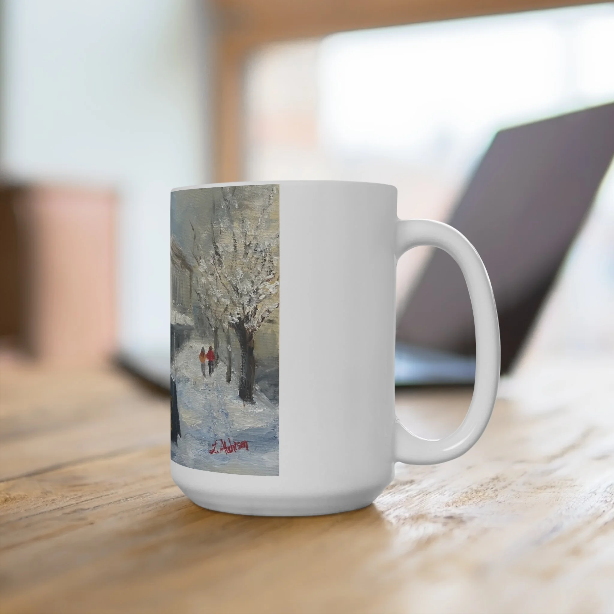 Warm-up with a nice cuppa out of this customized ceramic coffee mug. Printed with my "Listen to the Snow", a wintery downtown view of Granville. It will add a cozy feel to your morning routine.